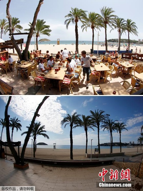 2 khung cảnh trái ngược trong cùng một góc máy ở bãi biển Magaluf. Ảnh: China News |