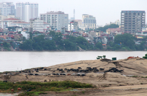 Điều mà ít người biết được, ngay bãi giữa sông Hồng có đàn trâu hàng trăm con được chăn thả hoàn toàn tự nhiên, đem lại thu nhập hàng trăm triệu đồng. Đơn cử như đàn trâu dưới chân cầu Vinh Tuy do ông Nguyễn Văn Tiến gây dựng đã được gần chục năm. Hiện tại, đàn trâu lên tới hơn 200 con.