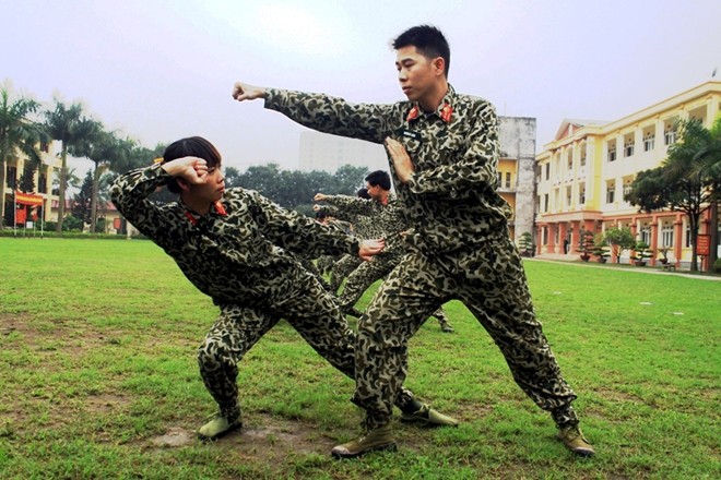 Các nữ quân nhân luyện tập các động tác võ chiến đấu, ngăn chặn đòn tấn công của đối phương. |
