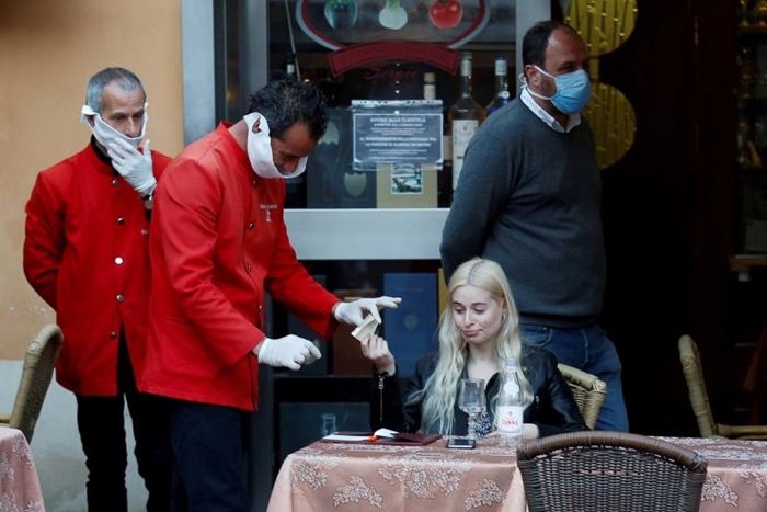 Một người phục vụ nhận tiền thanh toán trước khi đóng cửa quán sau lệnh phong tỏa tại Italy. Ảnh: Reuters |