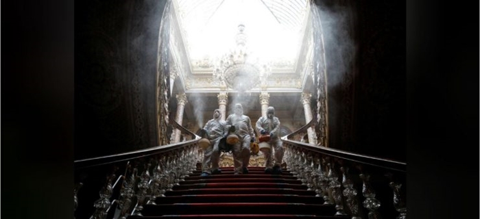 Công nhân mặc đồ bảo hộ khử trùng Cung điện Dolmabahce do lo ngại về Covid ở Istanbul, Thổ Nhĩ Kỳ. Ảnh: Reuters |