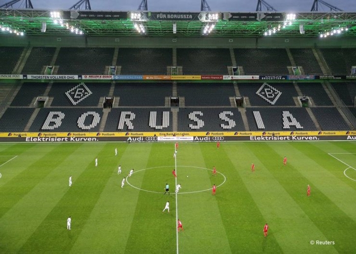 Trận đấu giữa Borussia Moenchengladbach và FC Cologne bắt đầu sau cánh cửa đóng kín ở Moenchengladbach, Đức, không có cổ động viên. Ảnh: Reuters |