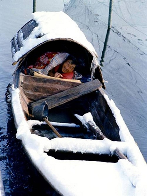 Cuộc đời phiêu bạt trên một chiếc thuyền bé nhỏ còn không đủ ấm vào mùa đông, nhưng người đàn ông trong hình vẫn tươi cười vì những gì mình có được.