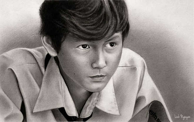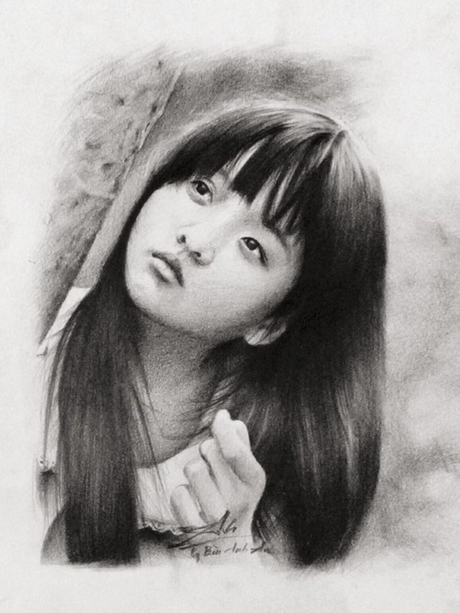 Nguyễn Thành Lợi (sinh viên ngành Kiến trúc) tự mày mò học vẽ từ năm lên 8. Bức chân dung bé Mận được chàng trai hoàn thành sau 8 tiếng. 9X cho biết, anh ban đầu dựng khung cho bức tranh, sau đó bắt đầu vẽ các chi tiết như mắt, mũi, miệng, tóc và áo là công đoạn cuối cùng.