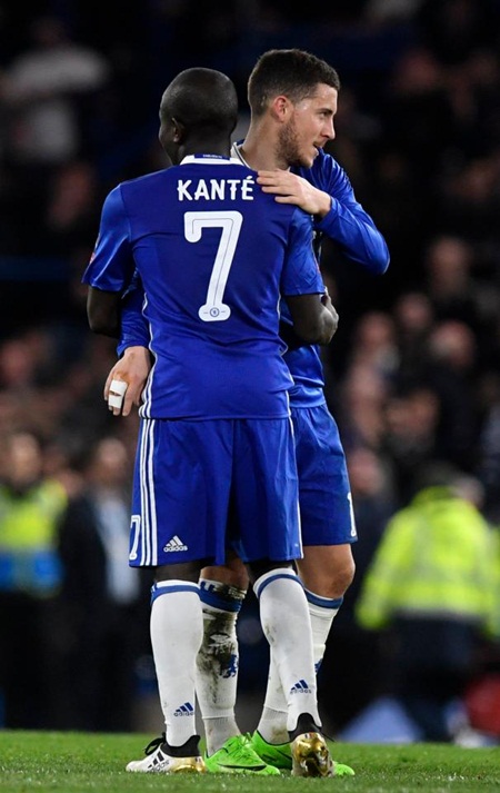 Kanté phải rất cố gắng để ngăn chặn đồng đội Eden Hazard. |