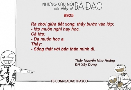 Trong thời gian ngồi trên ghế nhà trường, có lẽ chẳng có gì sướng bằng việc gặp được những thầy, cô giáo có kiến thức chuyên môn giỏi, nhiệt tình với học sinh mà vẫn tâm lý, hài hước và vui tính. Những câu nói hài hước của thầy, cô vừa khiến không khí lớp thêm vui vẻ, không căng thẳng lại vừa giúp thầy trò thêm gần gũi. Những câu nói như vậy được “trao truyền” qua rất nhiều thế hệ học sinh, hết lớp này qua lớp khác.