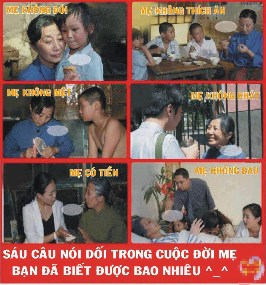 Trong bữa ăn, mẹ luôn nhường cho con những miếng ăn ngon. Nếu con cái thắc mắc, mẹ sẽ nói rằng: "Mẹ không đói", "Mẹ không thích ăn", "Mẹ không khát"....