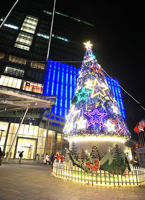 Cây thông Noel tại TP Thủ Dầu Một, tỉnh Bình Dương vào ngày 20/12 với ánh sáng, màu sắc rực rỡ về đêm. |