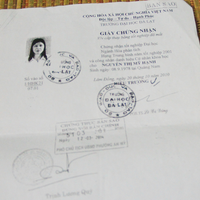 Qua điều tra của PV, Trưởng khoa Xét nghiệm TTDL Quảng Nam là bà Nguyễn Thị Mỹ Hạnh (SN 1978), tốt nghiệp Cử nhân ngành Hóa phân tích, trường ĐH Đà Lạt hạng trung bình năm 2001. Tuy nhiên, theo hồ sơ lưu tại TT, bà Hạnh chỉ có giấy chứng nhận tốt nghiệp, còn bằng tốt nghiệp đại học theo khai báo thì đã bị mất(?). Đây thực sự là một điều rất khó hiểu bởi trên thực tế ngành Hóa phân tích không liên quan gì đến công tác xét nghiệm tại TTDL.