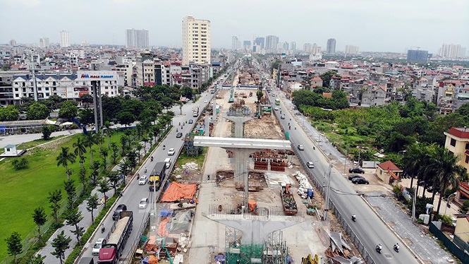 Đường vành đai 3 phía dưới đã hoàn thành, phía trên là cầu cạn đang được thi công. |