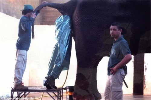 Không rõ chính xác công việc của người đàn ông này là gì, chỉ biết anh ta đang kiểm tra phần mông của con voi và chắc chắn việc này không hề dễ chịu chút nào.