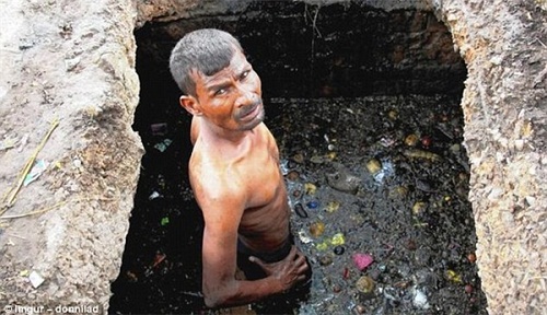 Nhìn hình ảnh này chắc bạn không khỏi hãi hùng. Trong hình là một người đàn ông Ấn Độ đang làm công việc nạo vét ống cống, người này hoàn toàn không mặc quần áo bảo hộ dù bị nước trong hầm ngập tới thắt lưng.