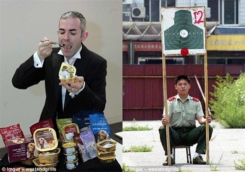 Người đàn ông ở tấm hình bên phải đang làm nhiệm vụ cầm tấm bia cho những người tập bắn. Còn người bên trái là Simon Allison, một người khá đam mê với nghề thử đồ ăn cho thú cưng như chó mèo. |