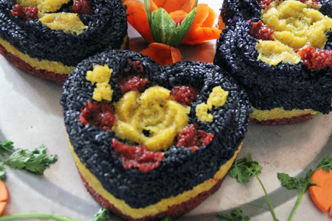 | Món xôi ba màu là món ăn độc đáo mang sắc thái riêng của văn hóa ẩm thực người dân tộc Nùng, huyện Lục Ngạn. Để tạo ra những màu sắc hấp dẫn của món ăn này, đồng bào sử dụng những nguyên liệu sẵn có từ thiên nhiên chứ hoàn toàn không sử dụng phẩm màu. |