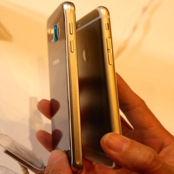 So dáng với iPhone 6 của Apple, điện thoại của Samsung khác biệt hẳn về ngôn ngữ thiết kế. Điện thoại của Apple dày 6,9 mm còn S6 của Samsung là 6,8 mm.
