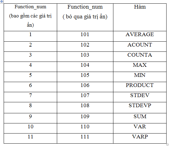 • Function_num là các con số từ 1 đến 11 hay từ 101 đến 111 tương ứng với cần hàm mà bạn cần tính.