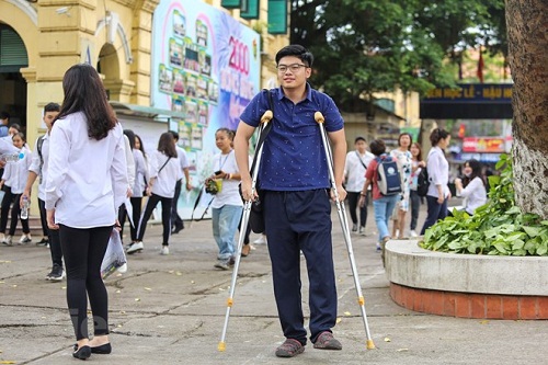 Nam thí sinh chống nạng đi dự thi. Ảnh: VietNamplus |