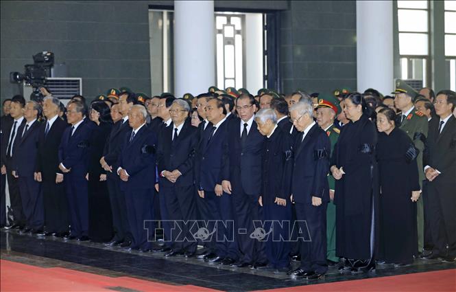 Tổng Bí thư Nguyễn Phú Trọng, Thủ tướng Nguyễn Xuân Phúc, Quyền Chủ tịch nước Đặng Thị Ngọc Thịnh, các đồng chí lãnh đạo, nguyên lãnh đạo Đảng, Nhà nước; Thủ tướng Lào Thongloun Sisoulith, các vị khách quốc tế cùng gia đình đồng chí Đỗ Mười dự Lễ truy điệu. |