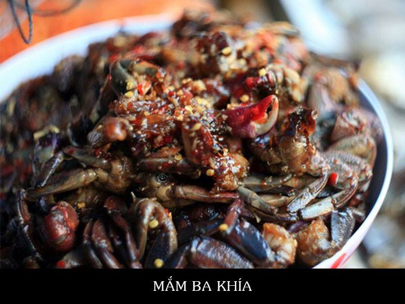 Mắm ba khía, là loại mắm được làm chủ yếu từ con ba khía (một loài họ cua có càng to, đặc trưng ở vùng Nam bộ. Ba khía rửa sạch bằng nước sôi, tách mai, đập dập sơ hai càng. Thêm tỏi, ớt, chanh, đường cát trắng vào rồi cho khóm bằm nhỏ, xoài xắt sợi, khế vừa chín tới xắt nhỏ, trái cóc đập dập. Trộn đều tất cả với ba khía, để đó cho thấm qua ngày thì ăn được. Ba khía ăn với cơm nguội mới đúng điệu, mà phải dùng tay bốc nữa. |