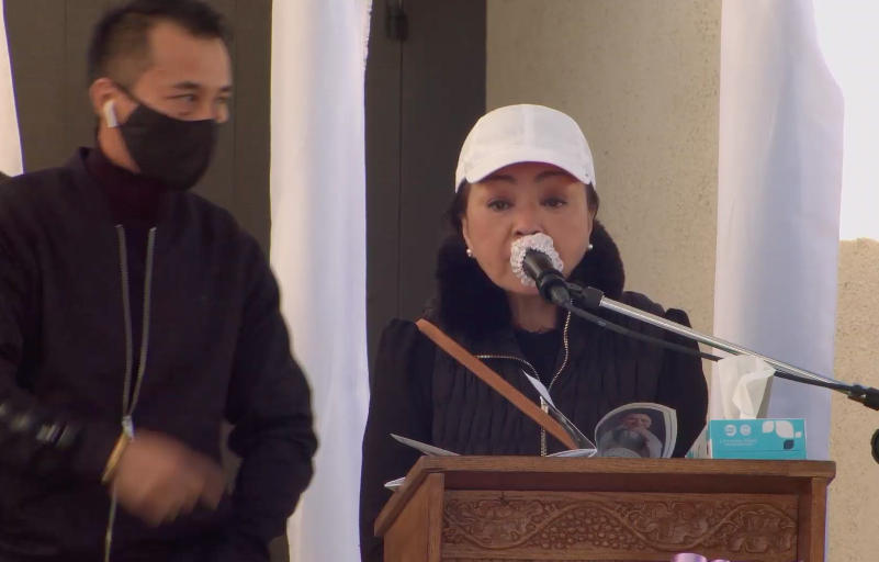 Trong lễ tang, bà xã Chí Tài - chị Phương Loan không kìm nén được nỗi đau mất người thân. Vợ cố nghệ sĩ khóc nghẹn trước linh cữu chồng.