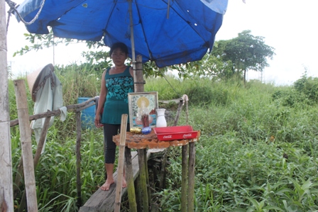 | Cạnh cây cầu đi vào thuyền, bà Huệ tự "thiết kế" một bàn thờ Phật |