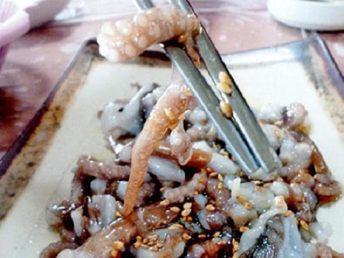Vòi bạch tuộc sống: Những chiếc vòi bạch tuộc vẫn còn động đậy được trộn với gia vị. Chỉ nhìn thôi đã khiến người phương Tây sởn gai ốc đừng nói là ăn. |