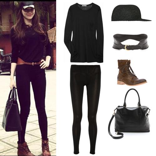 | Cô nàng "chất lừ" trong "cả cây" hàng hiệu bình dân. Áo T-shirt mỏng giá 1,8 triệu đồng của Alexander Wang, quần legging giá 1,2 triệu đồng của Spendid. |