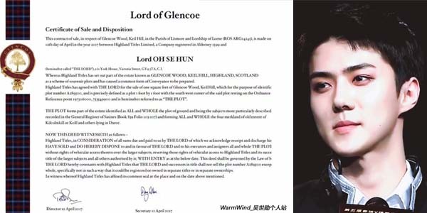 Các fan của EXO đã rất sáng tạo cho ngày sinh nhật thứ 23 của Sehun và quyết định tặng cho anh ấy một chút gì đó đặc biệt. Một EXO - L từ fansite của Trung Quốc có tên là Warmwind đã mua một mảnh đất tại Scotland. Lý do chính sau món quà khủng này là muốn trao danh hiệu “lãnh chúa” cho Sehun.