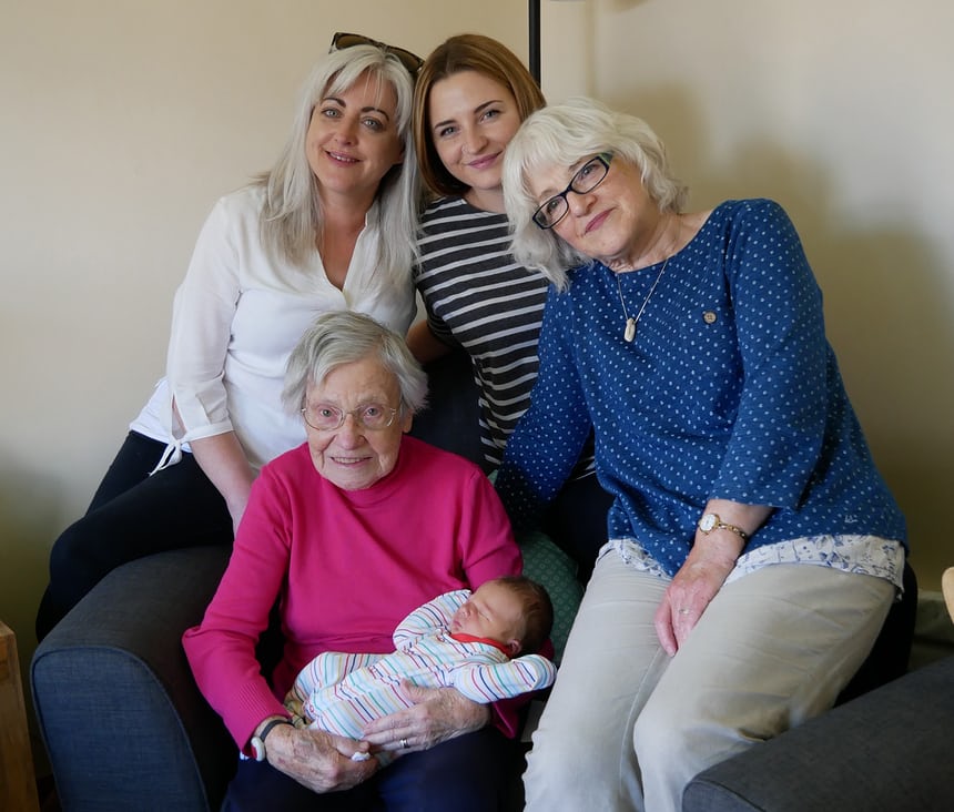 "Gia đình phải được đặt lên hàng đầu. Bạn hãy làm tất cả những gì có thể để bảo vệ và giáo dục con cái mình." - Marnie bế cháu đời thứ 5 của cụ, Jack, chụp ảnh cùng 4 thế hệ trong gia đình. |