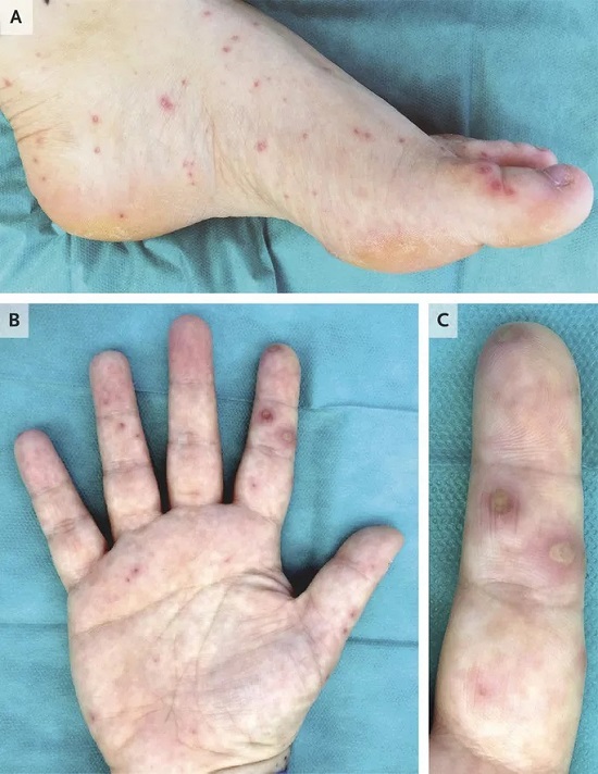 Người phụ nữ nhập viện với cơn đau khớp và những mụn lạ hành hạ. Ảnh: NEJM |