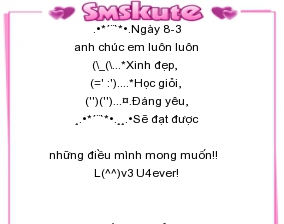 (ĐSPL) - Giành tặng bạn bè, người thân những tin nhắn 8/3 ý nghĩa nhất trong ngày Quốc tế phụ nữ bằng cách tự tay soạn những tin nhắn ngộ nghĩnh dưới đây nhé.