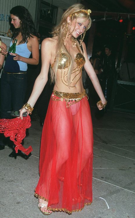 Trong lễ hôi Hallowen, cô nàng Play- girl của Hollywood cũng luôn nổi bât với trang phục phá cách khoe thân hình nóng bỏng. Halloween năm 2005, Paris Hilton "nổi loạn" trong bộ đồ lót màu hồng cùng với chiếc nơ “giả nai”. | | Rồi trở thành vũ nữ múa bụng với trang phục nóng bỏng, chiếc váy đỏ xuyên thấu tại lễ hội Halloween năm 2000. |