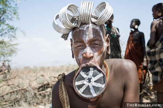 Sau cổ và dái tai, người ta còn kéo dài đôi môi để làm đẹp. Các phụ nữ ở bộ tộc Mursi ở phía bắc Ethiopia thường nhét những chiếc đĩa làm bằng đất sét vào môi dưới, thậm chí là cả môi trên của họ để để kéo dài môi ra. Khi đặt chiếc đĩa vào môi dưới, họ thường phải nhổ từ 2 đến 4 chiếc răng cửa để có thể nhét vừa chiếc đĩa vào môi dưới của mình. Đối với họ, môi càng to thì càng quyến rũ, càng thu hút sự chú ý của những người khác giới.