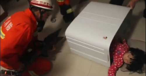Một bé gái 2 tuổi ở Ngô Trung, Ninh Hạ, Trung Quốc không hiểu sao lại bị mắc kẹt trong lồng vắt ly tâm nhỏ xíu của chiếc máy giặt. Những người lính cứu hỏa được đã phải tháo tung chiếc máy và lôi em ra ngoài. Rất may là em bé không bị thương.