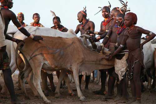Ở bộ tộc Hamar (phía đông thung lũng Omo, nam Ethiopia), nếu muốn lấy được vợ, một chàng trai phải thực hiện nghi lễ nhảy qua lưng bò trong tình trạng khỏa thân hoàn toàn. Họ phải nhảy qua lưng bò 4 lần để chứng minh sức mạnh của mình.