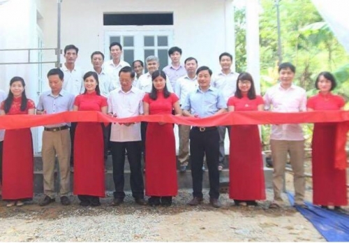 Đại diện nhà tài trợ, đơn vị tổ chức và chính quyền địa phương cắt băng khánh thành nhà tình nghĩa. |