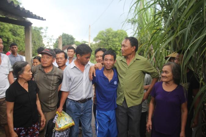 Anh Xuân vừa bước xuống xe, mọi người đã ùa vào ôm lấy. Người tay bắt mặt mừng, người vỡ òa trong dòng nước mắt hạnh phúc khi anh Xuân đã trở về quê nhà sau 4 năm bị bắt.