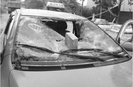 Không chỉ đánh người, chiếc xe taxi do anh Tr. điều khiển cũng bị người dân dùng gạch đá, gậy gộc đập, ném vỡ nát nhiều bộ phận như kính, cửa, ghế, vô lăng, đèn chiếu sáng và ném nhiều đá, đất vào trong xe. Sự việc sau đó cũng được báo nhanh lên chính quyền địa phương.