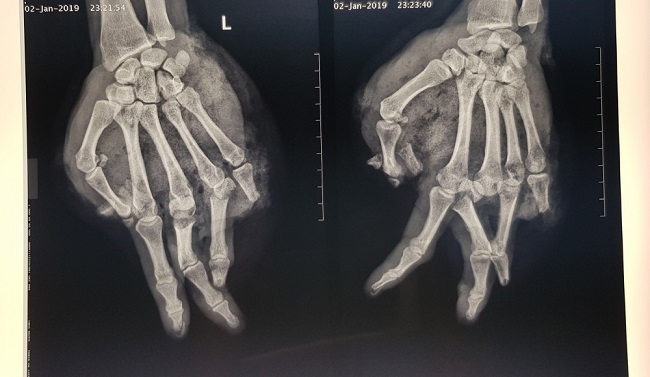 Hình ảnh phim chụp X-quang cho thấy bàn tay của bị bệnh nhân bị chấn thương. Ảnh: Bệnh viện cung cấp. |