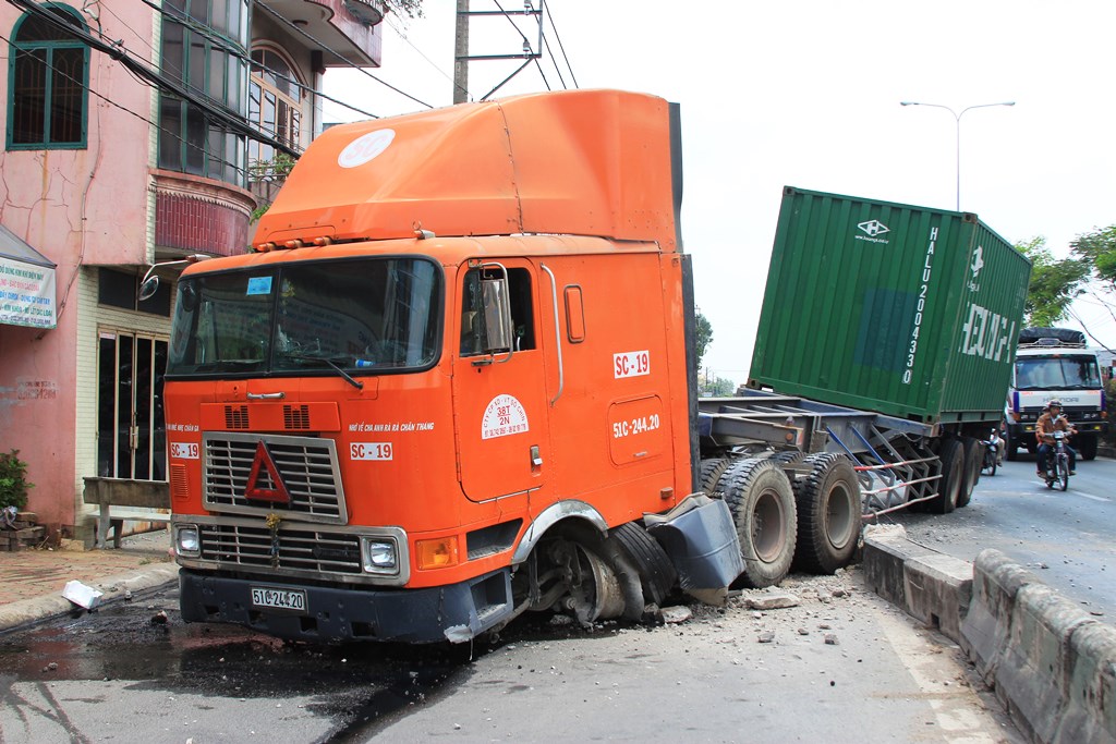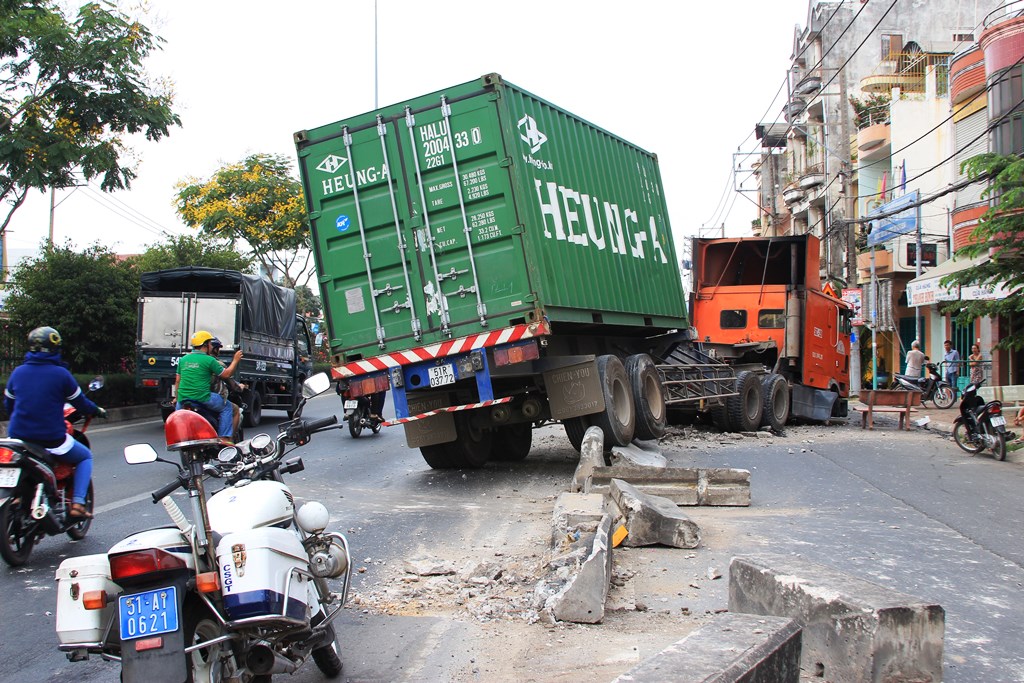 Tại hiện trường, xe container bị hư hỏng nặng. Hàng chục mét dải phân cách bị húc văng tung tóe trên đường. Dầu diesel đổ lênh láng khắp mặt đường do thùng chứa của xe bị thủng.