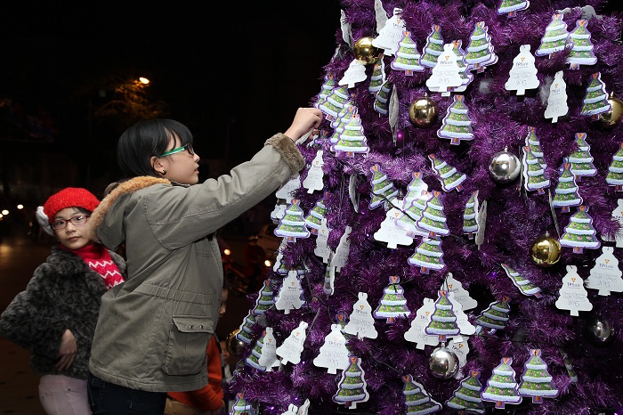 Một cây thông màu tím khá lạ mắt được treo những tấm thiệp điều ước của người dân. |