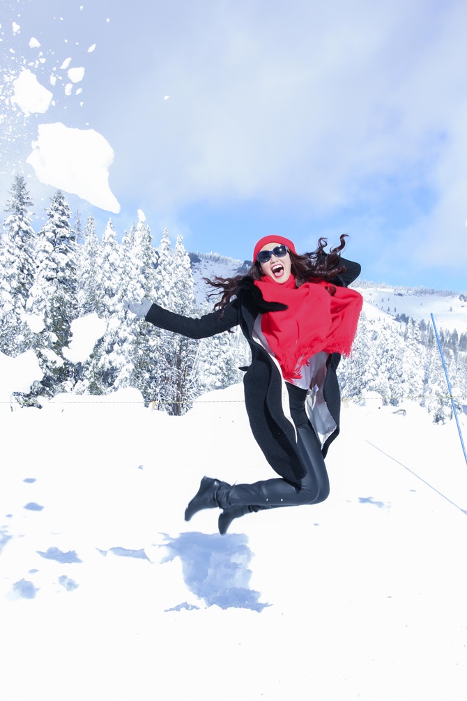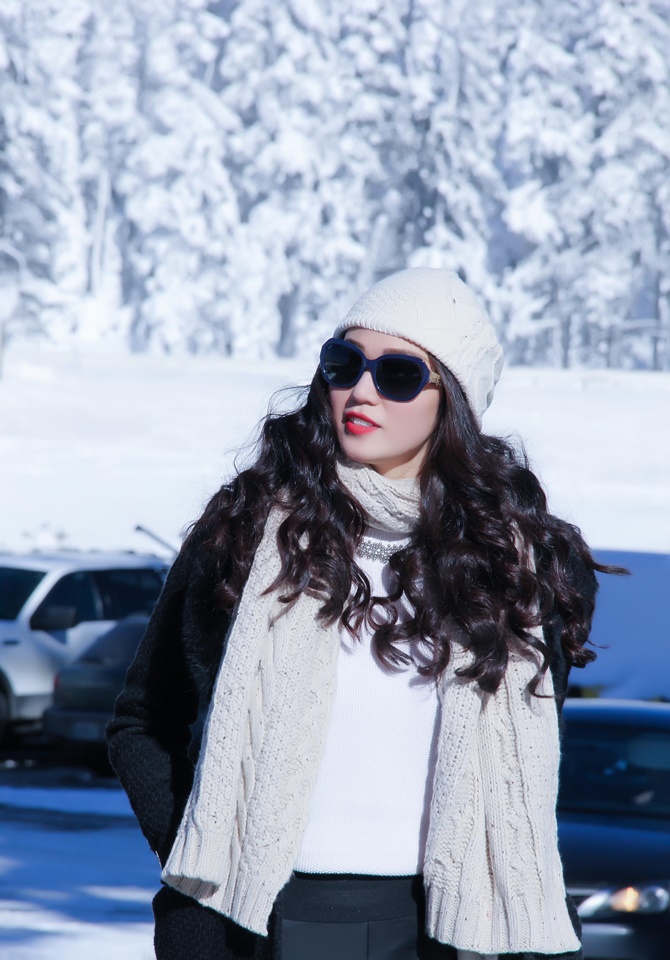 | Vì thời tiết khá lạnh nên cô nàng chọn cho mình tregging da, áo thun trắng cổ lọ, áo khác măng tô dày phối cùng mũ và khăng choàng đỏ nổi bật và ấm áp. Từ chỗ “Mỹ nhân Sài thành” ở đến chỗ có tuyết phải mất 2 tiếng đi xe. |