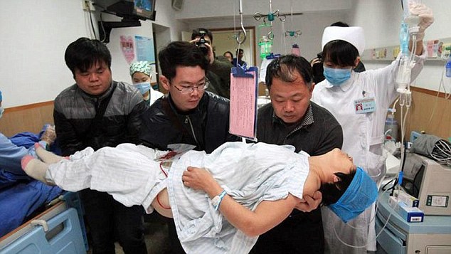 Li Haiqing và cha nâng bà Lian Ronghua xuống phòng hồi sức sau ca mổ lấy thận. |