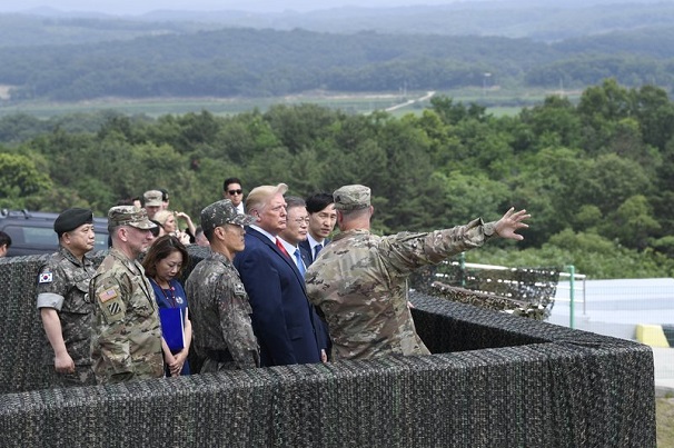 Chiều 30/6, Tổng thống Mỹ Donald Trump đã đến vùng phi quân sự (DMZ) nằm giữa biên giới hai miền Triều Tiên bằng trực thăng quân sự, sau đó được đoàn xe tháp tùng vào khu vực đài quan sát.