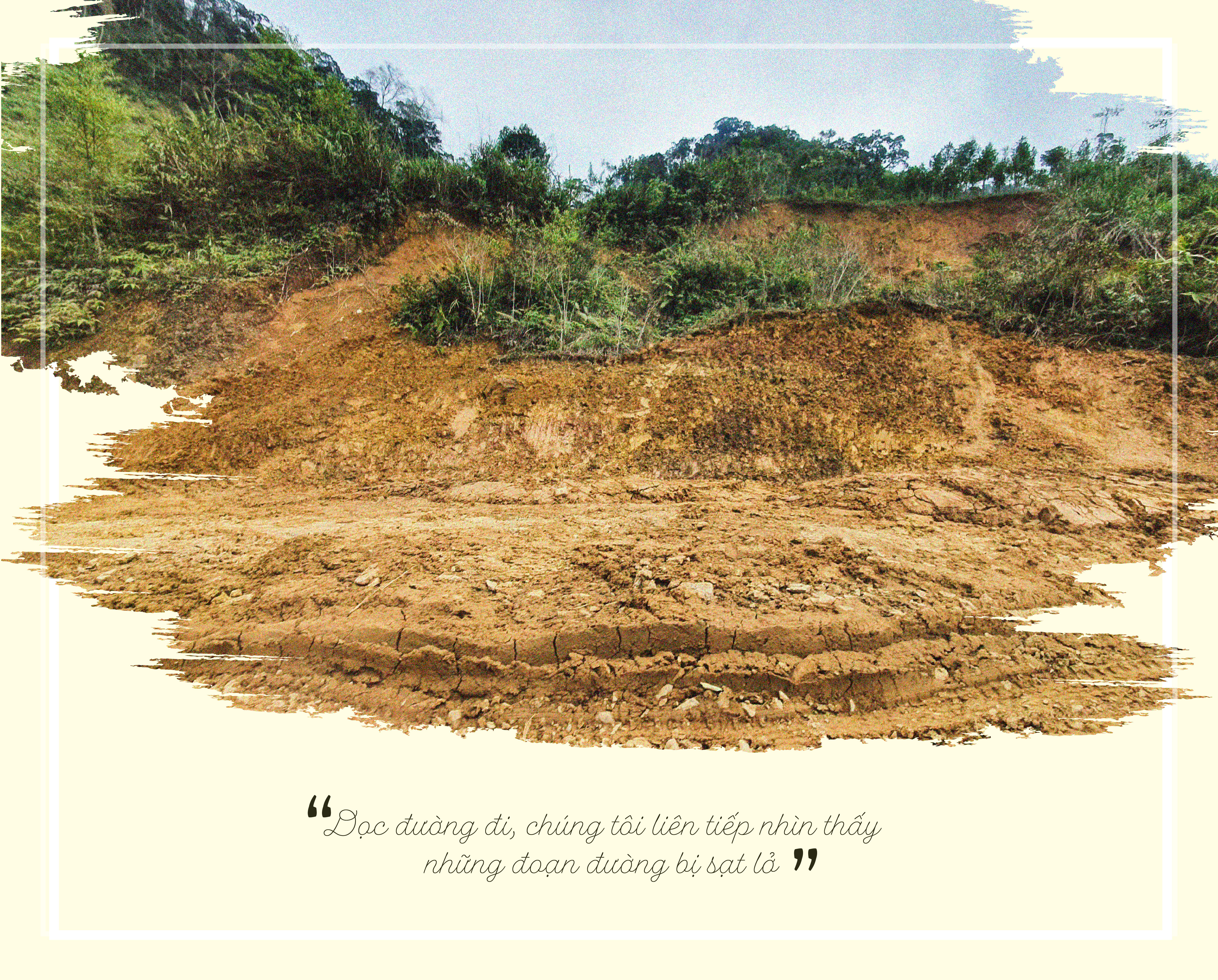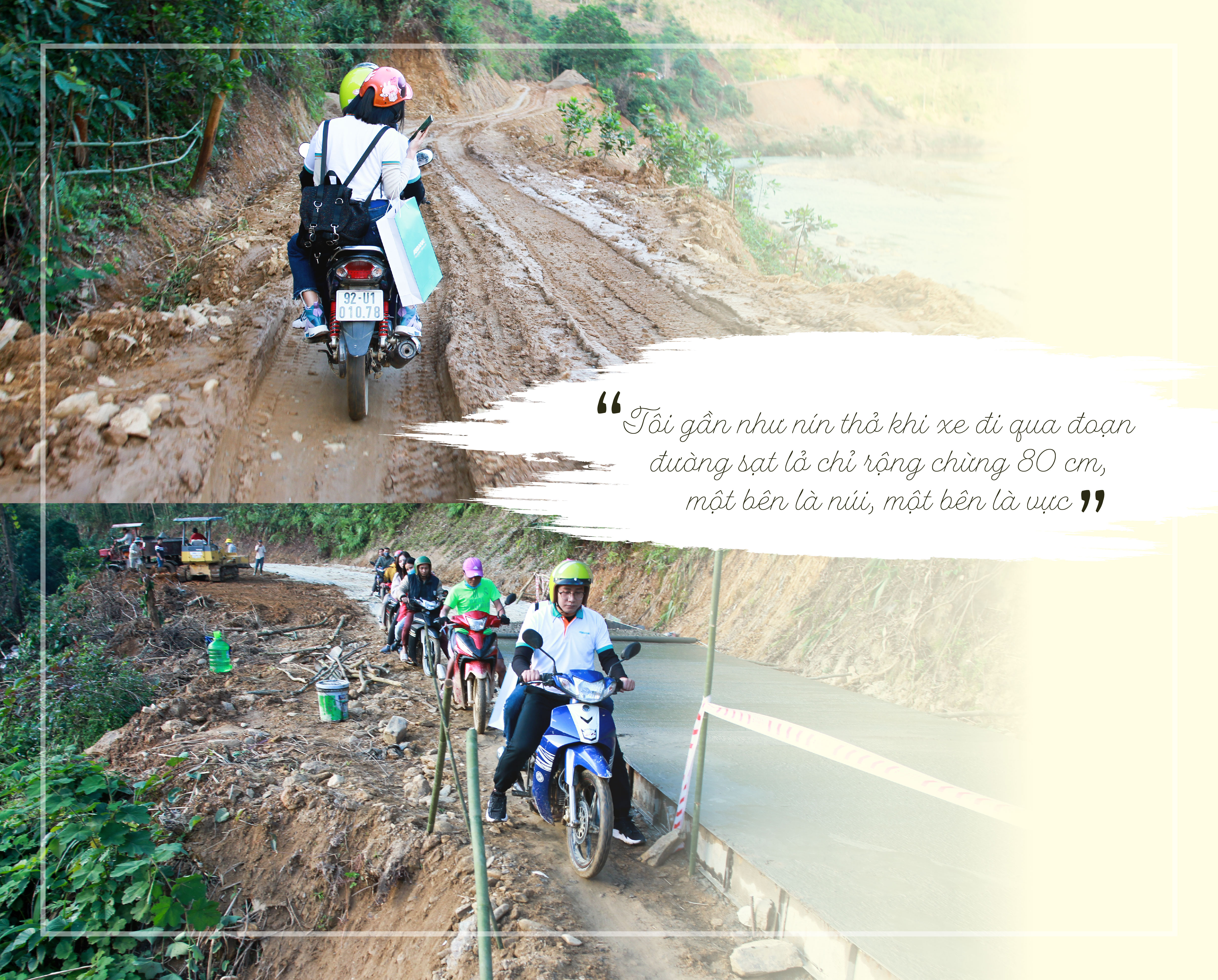 Chúng tôi đến với Ch’ơm 4 tháng sau cơn bão. Quãng đường từ trung tâm huyện Tây Giang đến Ch’ơm khoảng 52 km nhưng phải di chuyển hơn 2 giờ đồng hồ. Dọc đường đi, liên tiếp những đoạn đường bị đứt gãy, lở hàm ếch, vết sạt lở vẫn còn rất mới dù nhiều tháng đã trôi qua. Khi chúng tôi ngỏ ý muốn quay lại đoạn đường sạt lở vừa bỏ qua để chụp hình ảnh thực tế, anh lái xe của đoàn cho biết còn rất nhiều những đoạn đường sạt lở nghiêm trọng hơn, càng đến gần Ch’ơm, sạt lở càng nặng bởi những đoạn gần trung tâm huyện đã được tỉnh khắc phục dần dần. Anh cũng cho biết, thông thường cũng rất ít cơ hội để tiếp cận Ch’ơm hay Gary vì đường sá khó khăn, lại không có phương tiện giao thông công cộng “dám” chạy trên cung đường này. Bởi ngay cả khi thời tiết tốt, chỉ đến tầm 3h chiều, sương mù đã che phủ các cung đường, rất khó để quan sát nếu không phải dân bản địa. Và chúng tôi đã có gần 2 giờ đầy căng thẳng, nín thở khi quan sát anh căng mắt ôm vô lăng, gần như nhoài hẳn người ra phía trước kính xe để dò đường, thi thoảng lại đột ngột bấm còi xe khi gặp các trường hợp khẩn cấp.