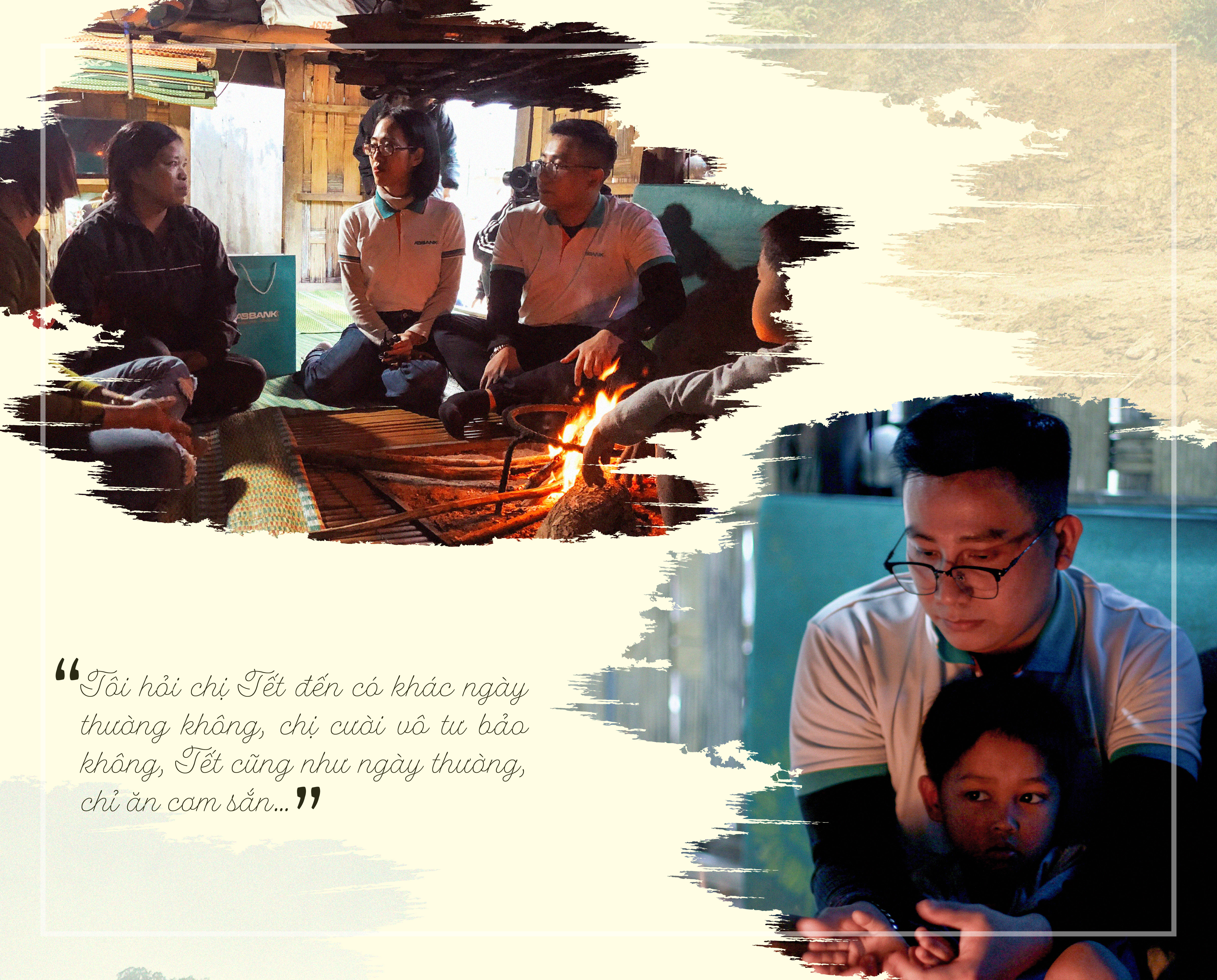 Thôn A réc là một trong những thôn gần đường liên huyện, còn dễ tiếp cận hơn nhiều so với các thôn khác thuộc xã A Vương, nơi người dân sống rải rác theo các thôn, cách nhau phải vài giờ đi bộ. Nhà chị Arin, có 3 người, ở ngay đầu thôn. Nói là nhà, nhưng thực chất chỉ là một căn lều tranh cất theo lối nhà sàn truyền thống của người Cơ tu, rộng chưa đến 10m2. Một chiếc bếp lửa vừa giúp thắp sáng, vừa giúp sưởi ấm. Nhà có 3 người, hai vợ chồng có 1 cậu con trai năm nay bắt đầu vào lớp 1. Sinh kế của cả gia đình là làm rẫy, trồng ngô, sắn. Hỏi chị Arin Tết đến có khác ngày thường không, chị cười vô tư bảo không, Tết cũng như ngày thường, chỉ ăn cơm sắn, cũng không có gì. Nhưng nhắc tới hoàn cảnh gia đình, người chồng bị tàn tật, đợt lũ vừa rồi cả nhà phải xin ở nhờ các nhà trong thôn, chị khóc. Những giọt nước mắt loang loáng dưới ánh lửa bập bùng. Cậu con trai thấy mẹ khóc, ngồi co lại, vừa vì lạnh, vừa vì lo sợ. Sau khi trao quà, hỏi thăm gia đình, khi chúng tôi định rời đi, chị dè dặt bảo có con gà muốn gửi tặng để cảm ơn mọi người. Một bữa cơm Tết còn không có thịt để ăn, nhưng chị chân thành và nồng hậu tặng chúng tôi một con gà để làm quà cảm ơn, tôi thực sự cảm động. Bởi người ta dễ cho người khác khi mình đã có đủ, nhưng khi bản thân còn đang thiếu, người dân ở đây vẫn sẵn sàng cho đi…
