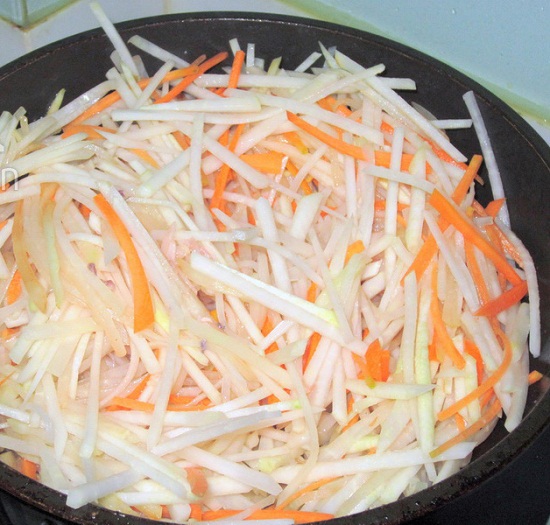 Cho su hào, cá rốt đã bào sợi mỏng trần qua nước sôi để loại bớt mùi hăng của su hào, rồi vắt khô.