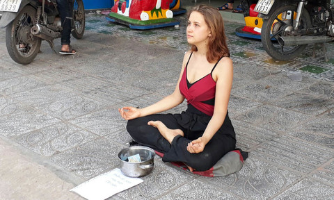 Cô gái quốc tịch Nga xinh xắn ngồi "thiền" xin tiền tại ngã ba đường Mạc Cửu - Trần Phú (Phú Quốc) vào tháng 8/2017 - Ảnh: Báo Công An. |