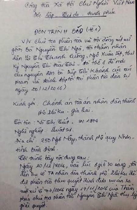 Đơn tố cáo của nữ luật sư gửi đến các cơ quan chức năng. (Ảnh: Tiền Phong) |