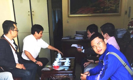 Luật sư Tạ Quang Tòng (áo trắng) đang làm việc với các PV. (Ảnh Hải Nam) |